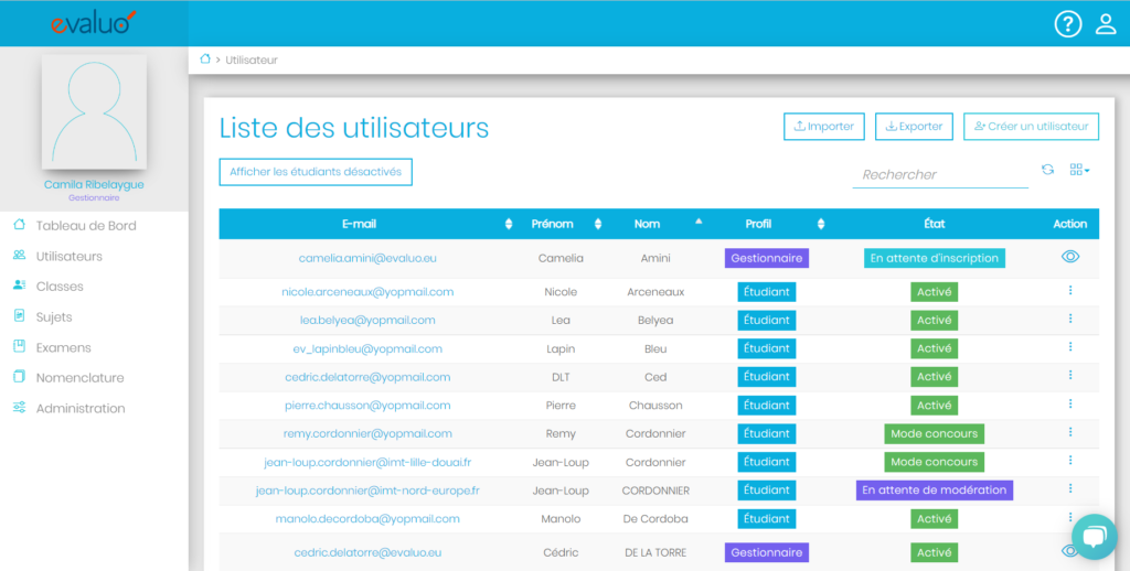 Désactivez les élèves qui ne font plus partie de votre établissement. Ils ne pourront plus passer d’examen sur votre plateforme, mais pourront toujours se connecter pour consulter leurs résultats.
