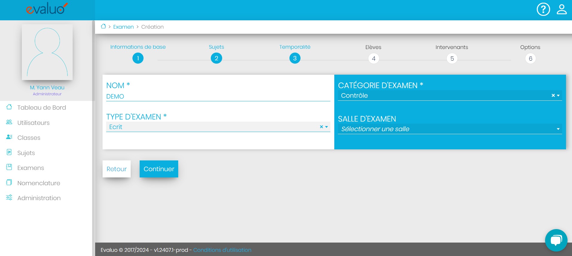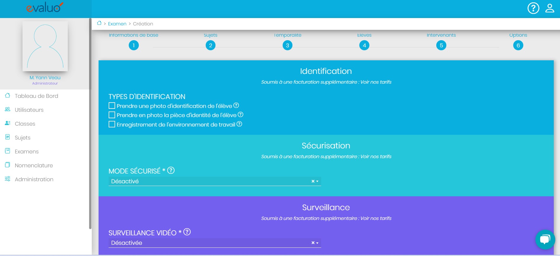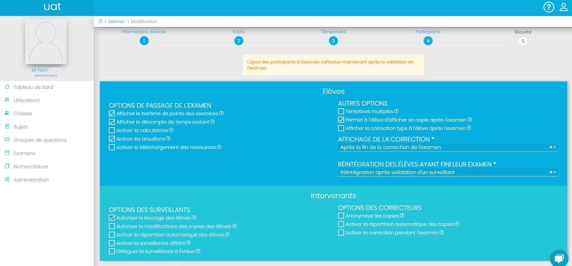 La création d’un examen se fait en 5 étapes :