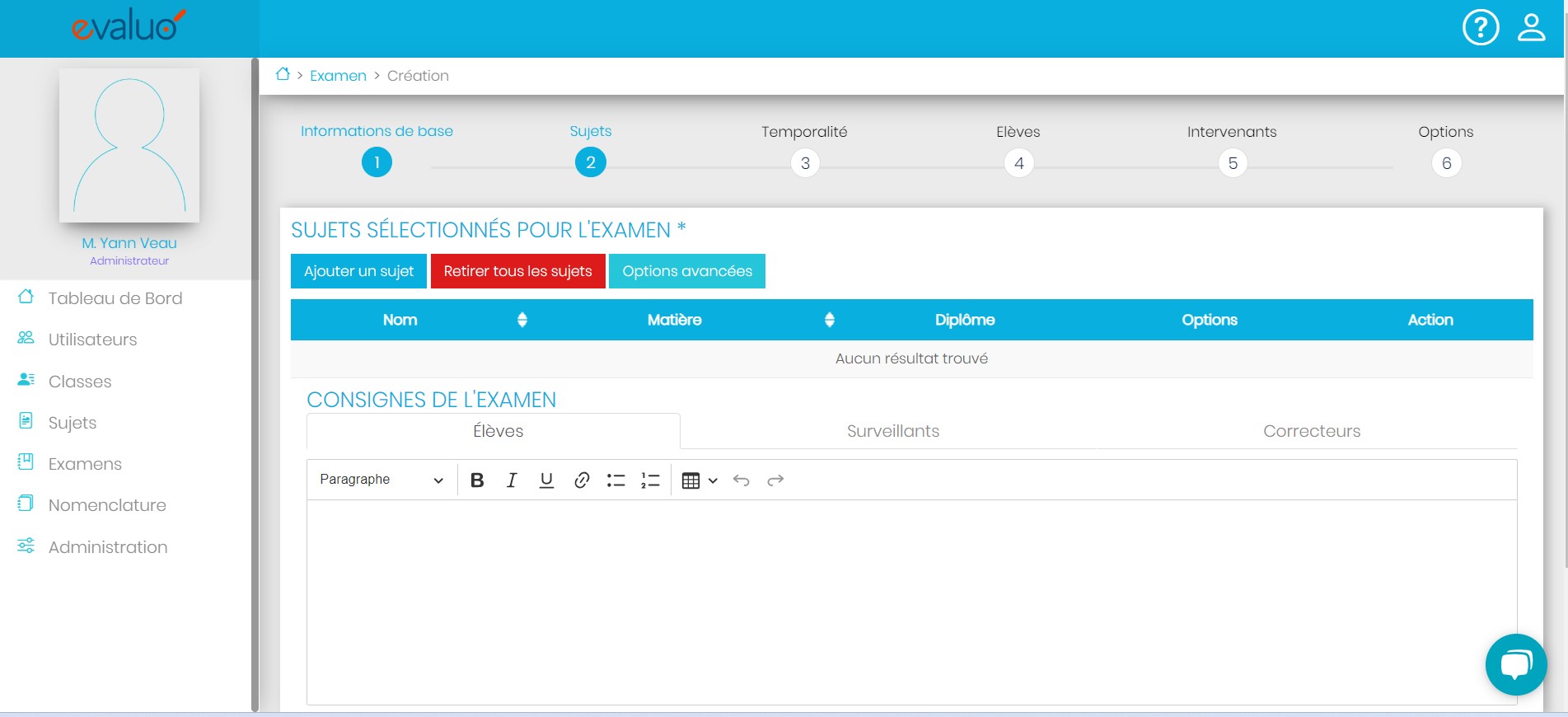 Dans cette étape en cliquant sur « Ajouter un sujet » vous pourrez retrouver le ou les sujets que vous avez créé au préalable dans l’examen.