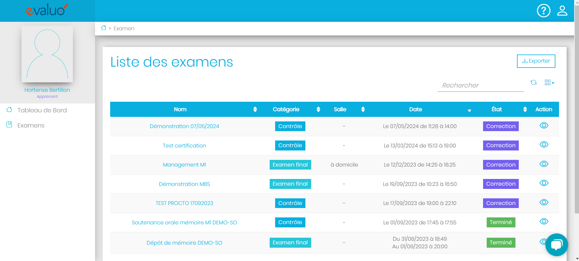 Le menu de gauche vous permet d’accéder aux différentes fonctionnalités qui vont vous permettre de passer vos examens et visualiser vos résultats :