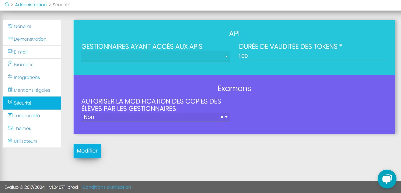 Gérez vos paramètres de sécurité (API, examens).