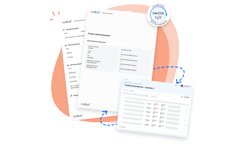 Les candidats passent en ligne avec contrôle d’identité et proctoring. Sessions disponibles 24/7, preuves enregistrées, PV et feuilles d’émargement électroniques centralisés.